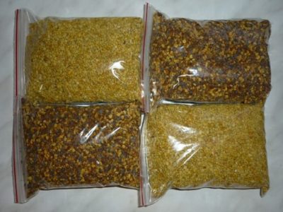 - Blütenpollen oder Bienenbrot – Pollen verschiedener Pflanzen, den die Bienen sammeln, mit Nektar befeuchten, in Wabenzellen legen, stampfen und mit Honig gießen.