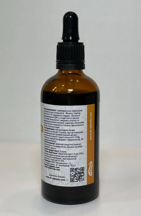 Способ применения: настойку принимают внутрь, добавляя в ложку с водой, молоком или маслом, для профилактики инфекционных заболеваний – по 15-20 капель с раза в день в течение 25-30 дней. Для лечения взрослым и детям от 12 лет рекомендуется принимать внутрь по 20-30 капель настойки (дозировка зависит от веса, возраста и тяжести заболевания) 3-4 раза в день за 30 минут до еды или 30 минут после еды в течение месяца. После двухнедельного перерыва при необходимости курс повторить, для полоскания развести 20-25 капель настойки в 100 мл теплой кипяченой воды. Продолжительность применения препарата от достигнутого лечебного эффекта и определяется врачом.